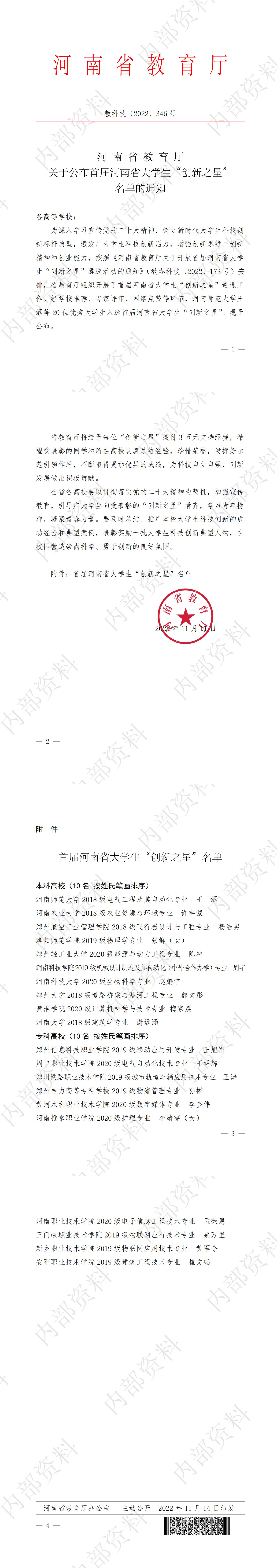 关于公布首届河南省大学生“创新之星”名单的通知.pdf